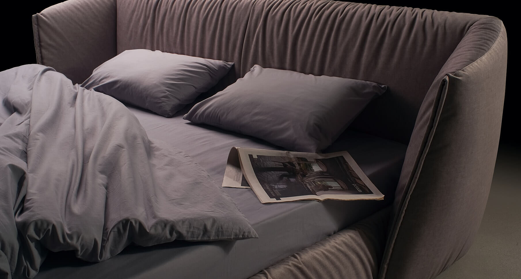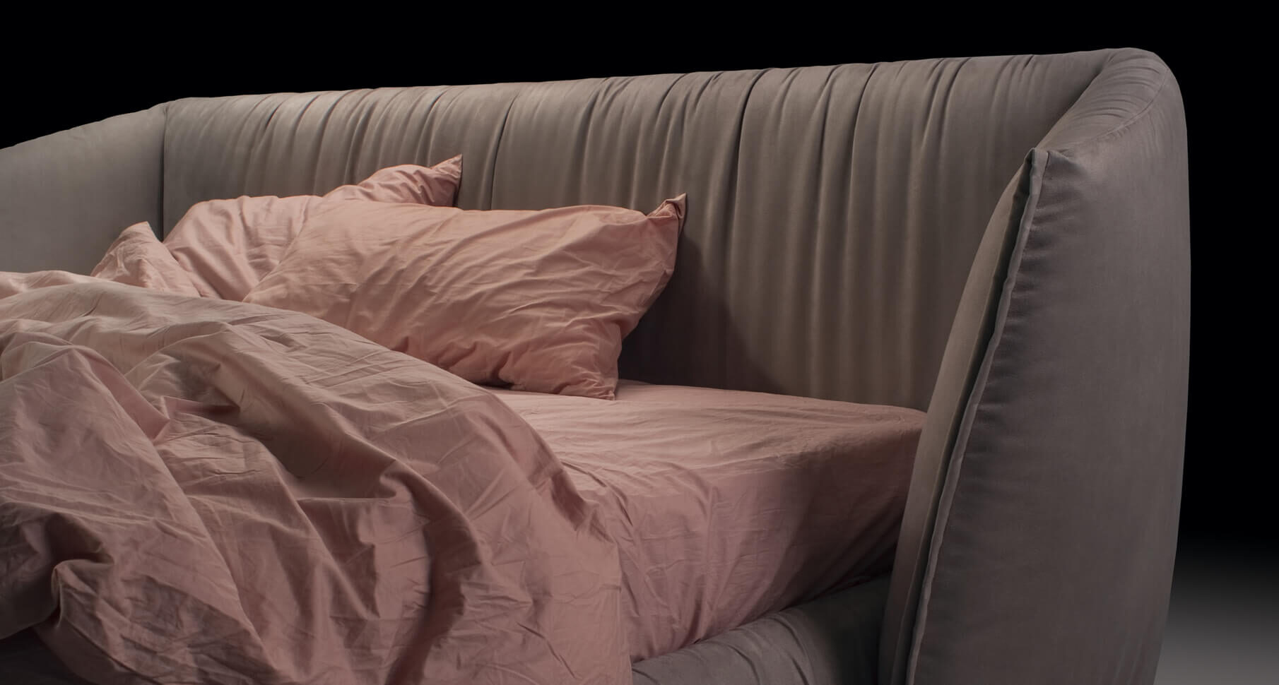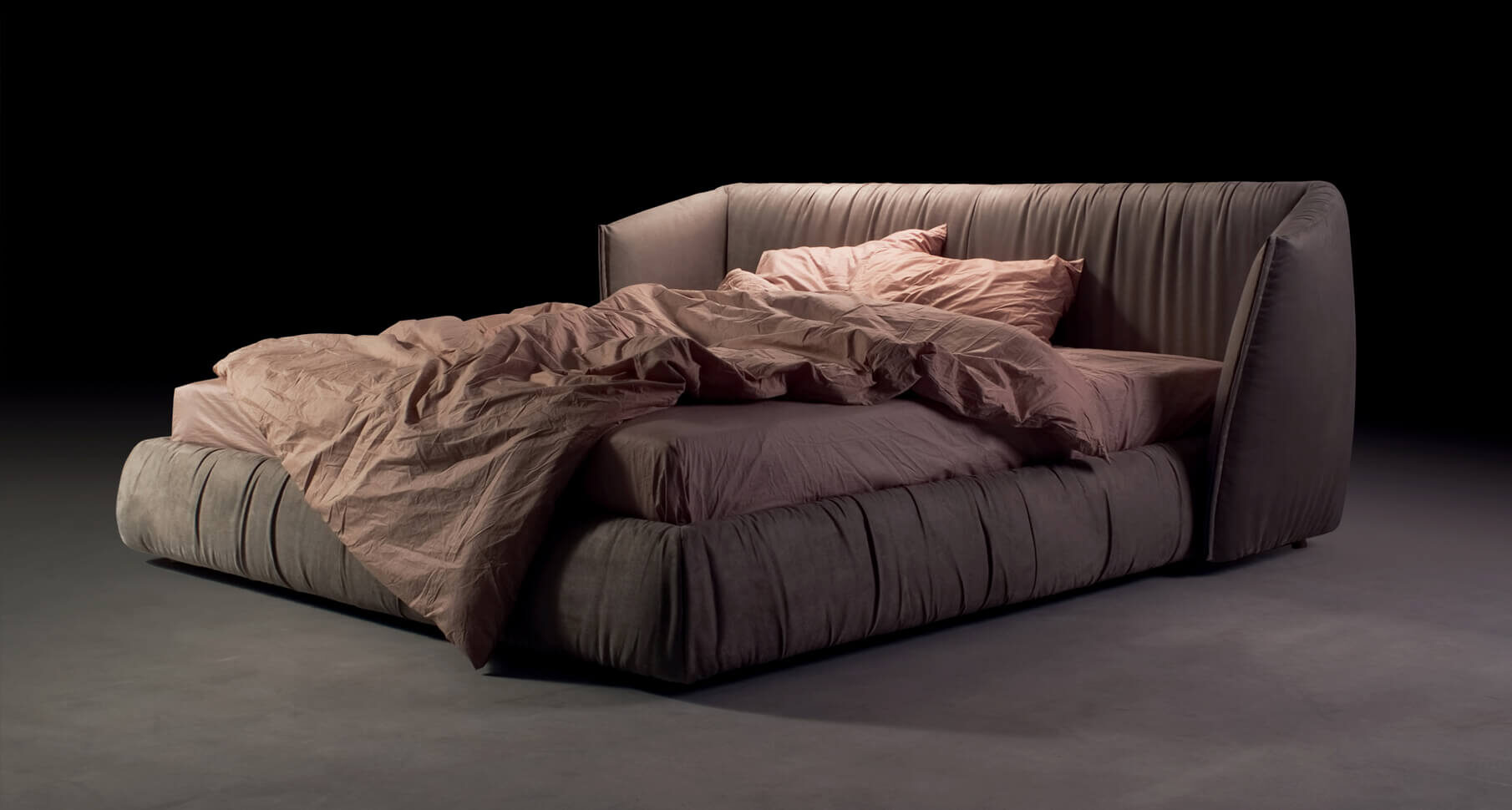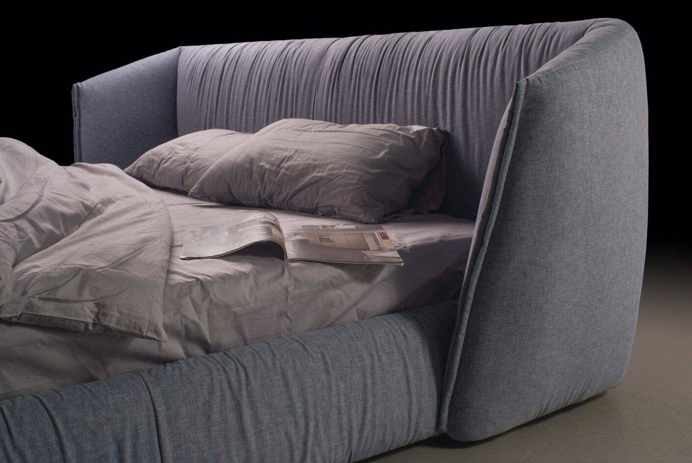Новую кровать Too night от фабрики Blanche нельзя сравнить ни с чем другим, что мы создавали до этого. Ее главное достоинство — особо уютная зона изголовья. Это не просто яркое дизайнерское решение. Она создают ощущение особого уединения, интима. Посмотрите на ткань, обтягивающую кровать. Видите, она собирается красивыми складками. Здесь это оттенок игры, яркого стилевого решения.